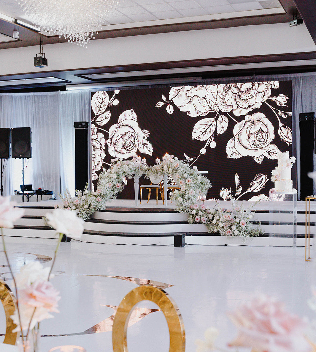 Elevate the room with screen designs. These static or moving visuals ensure perfect visual harmony, providing a subtle, refined backdrop early in the evening before shifting to custom, dynamic projections that amplify the energy of the dance experience.